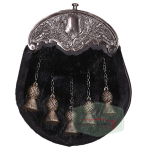Black Full Dress Formal Fur Sporran with 5 Tassels – Black Rabbit Fur, Stylish & Elegant