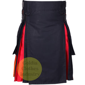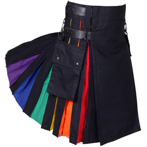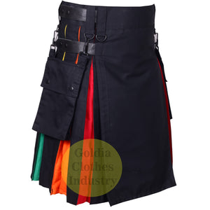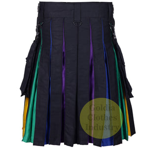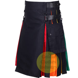 Black Leather Straps Rainbow Pleats Utility Kilts for Men