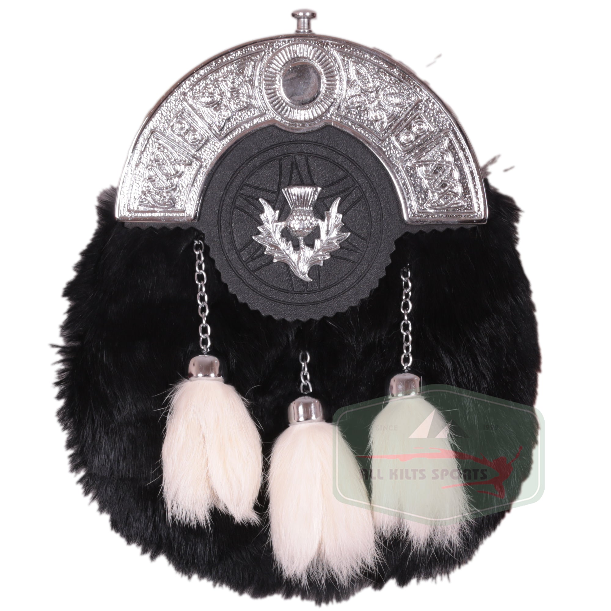 Black Rabbit Fur Sporran with Thistle Badge and White Tassels – Elegant Highland Accessory