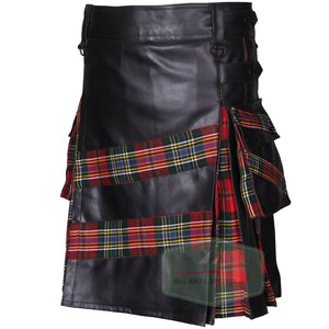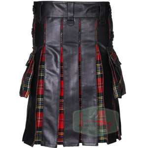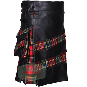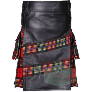 Men's Genuine Cowhide Leather Hybrid Kilt with Cargo Pockets & Tartan Accents