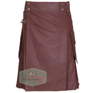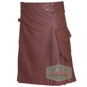 Men's Genuine Cowhide Light Brown Leather Kilt with Cargo Pockets