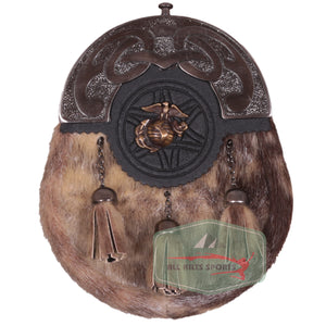 Scottish Fur Sporran with American Marine Corps Badge and Antique Bronze Finish | Chain & Leather Strap Included"