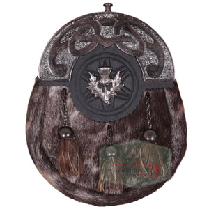 Scottish Rabbit Fur Sporran with Antique Full Dress Thistle Badge and Celtic Knot Cantle | Chain & Leather Strap Included