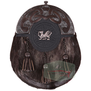 Scottish Rabbit Fur Sporran with Welsh Dragon Badge and Antique Knotwork Cantle | Chain & Leather Strap Included